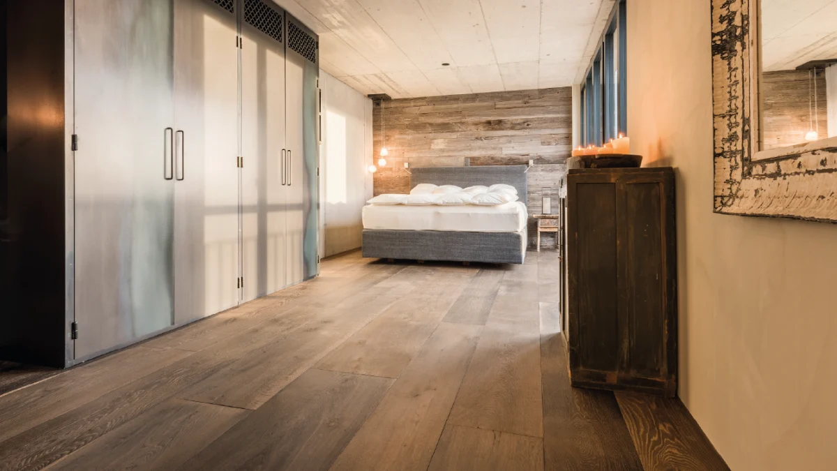 Naturgeölte Eichendielen von FB Hout mit ruhiger Sortierung im Schlafbereich. Zertifizierte Hölzer und reparaturfähige Ausführung unterstützen ein gesundes Raumklima.